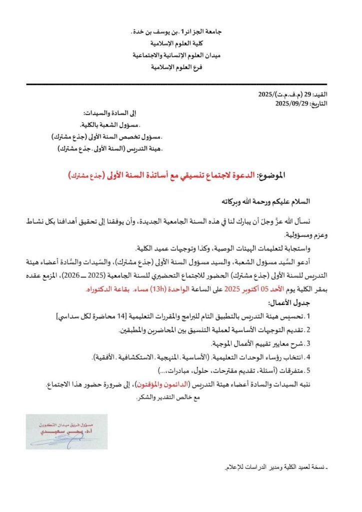 Continue Reading Previous إعلان هامNext إعلان بخصوص دفع حقوق التسجيل للمقبولين في فئه ماستر 20% اترك تعليقاً إلغاء الردلن يتم نشر عنوان بريدك الإلكتروني. الحقول الإلزامية مشار إليها بـ *التعليق * الاسم * البريد الإلكتروني * الموقع الإلكتروني احفظ اسمي، بريدي الإلكتروني، والموقع الإلكتروني في هذا المتصفح لاستخدامها المرة المقبلة في تعليقي. مقالات مشابهة فضاء الإعلانات المتفرقة إعلان عن انعقاد المجلس العلمي للكلية 15 سبتمبر، 2025 facsi فضاء الإعلانات المتفرقة إعلان عن إستشارة رقم 2025/04/ك.ع.إ/2025 9 سبتمبر، 2025 facsi فضاء الإعلانات المتفرقة فتح باب الترشح للتسجيل في فئة 20 % بطور الماستر للسنة الجامعية 2026-2025 21 يوليو، 2025 facsi 1