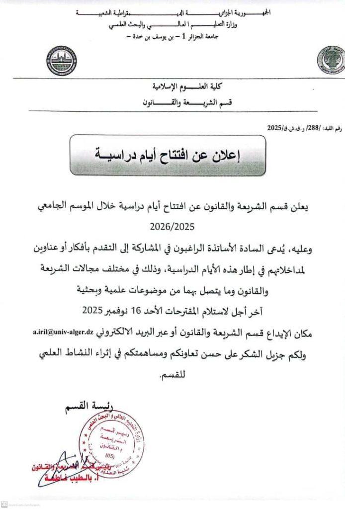 Continue Reading Previous مخرجات الإجتماع التنسيقي لطور الماستر(1-2) اترك تعليقاً إلغاء الردلن يتم نشر عنوان بريدك الإلكتروني. الحقول الإلزامية مشار إليها بـ *التعليق * الاسم * البريد الإلكتروني * الموقع الإلكتروني احفظ اسمي، بريدي الإلكتروني، والموقع الإلكتروني في هذا المتصفح لاستخدامها المرة المقبلة في تعليقي. مقالات مشابهة طور الماستر فضاء الإعلانات المتفرقة مخرجات الإجتماع التنسيقي لطور الماستر(1-2) 14 أكتوبر، 2025 facsi اعلانات للأساتذة فضاء الإعلانات المتفرقة دعوة لاجتماع تنسيقي مع أساتذة السنة الأولى (جذع مشترك) 2 أكتوبر، 2025 facsi فضاء الإعلانات المتفرقة إعلان عن انعقاد المجلس العلمي للكلية 15 سبتمبر، 2025 facsi