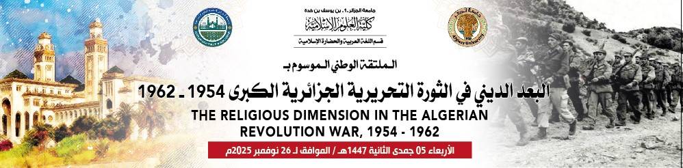 الملتقى الوطني حول الثورة في شهر الثورة بحضور أكثر من 15 جامعة وطنية لمناقشة موضوع جد هام وهو البعد الديني في الثورة التحريرية برياسة الأستاذ الدكتور بن نعمان سيد أحمد الاربعاء المقبل 26 نوفمبر في رحاب كلية العلوم الإسلامية جامعة الجزاىر 1.