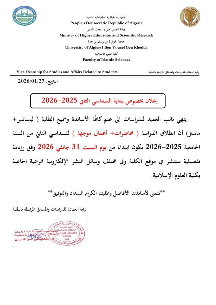 Continue Reading Previous إعلان بخصوص الإطلاع على أوراق الامتحانات اترك تعليقاً إلغاء الردلن يتم نشر عنوان بريدك الإلكتروني. الحقول الإلزامية مشار إليها بـ *التعليق * الاسم * البريد الإلكتروني * الموقع الإلكتروني احفظ اسمي، بريدي الإلكتروني، والموقع الإلكتروني في هذا المتصفح لاستخدامها المرة المقبلة في تعليقي. مقالات مشابهة طور الليسانس فضاء الطالب إعلان بخصوص الإطلاع على أوراق الامتحانات 26 يناير، 2026 facsi فضاء الطالب تعديل في امتحانات الدورة العادية الأولى 25 ديسمبر، 2025 facsi فضاء الطالب إعلان هام للطلبة المقبلين على التخرج 2025-2026 11 ديسمبر، 2025 facsi