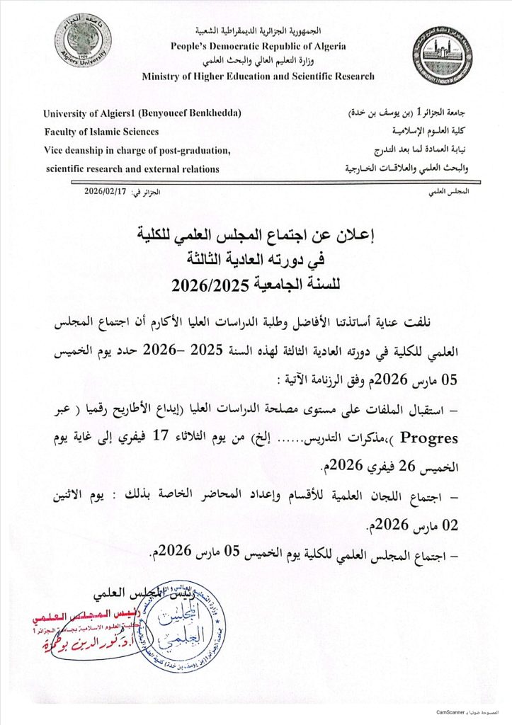 Continue Reading Previous رزنامة التوقيت الاسبوعي للسداسي الثاني -طور الماستر-Next الترشح لعضوية لجنة الحوار الاجتماعي اترك تعليقاً إلغاء الردلن يتم نشر عنوان بريدك الإلكتروني. الحقول الإلزامية مشار إليها بـ *التعليق * الاسم * البريد الإلكتروني * الموقع الإلكتروني احفظ اسمي، بريدي الإلكتروني، والموقع الإلكتروني في هذا المتصفح لاستخدامها المرة المقبلة في تعليقي. مقالات مشابهة فضاء الإعلانات المتفرقة الترشح لعضوية لجنة الحوار الاجتماعي 17 فبراير، 2026 facsi فضاء الإعلانات المتفرقة إعلان عن مسابقة التوظيف على أساس الشهادات للإلتحاق بسلك الأساتذة المساعدين رتبة :أستاذ مساعد 31 ديسمبر، 2025 facsi فضاء الإعلانات المتفرقة إعلان عن انعقاد المجلس العلمي للكلية 16 نوفمبر، 2025 facsi